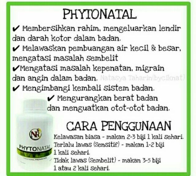 Ia menambahkan daya tenaga semasa dalam pantang mengimbangi kembali sistem badan. KHASIAT DAN CARA PENGAMBILAN PHYTONATAL. NR Phytonatal 90 Tablet Digunakan secara tradisional untuk menguatkan badan dan mengurangkan berat badan selepas bersalin.